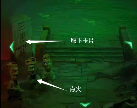 5、石门外是刚刚左边的路,往前走到了一条河边,使用三炷香在三个石头人的眼睛上点火,获得点燃的三炷香,使用匕首取下石碑上的玉片。