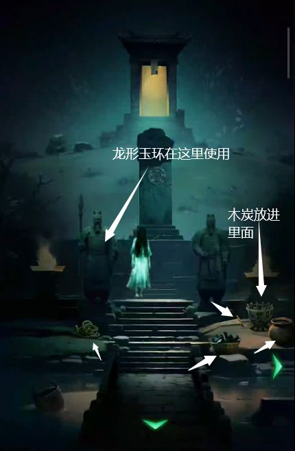 12、过桥,地上获得木炭、绳子、罐子、断刀,木炭放进火架,使用火把点燃,把断刀变成烧红的断刀。龙行玉环放在左边人俑身上,获得玛瑙火焰。