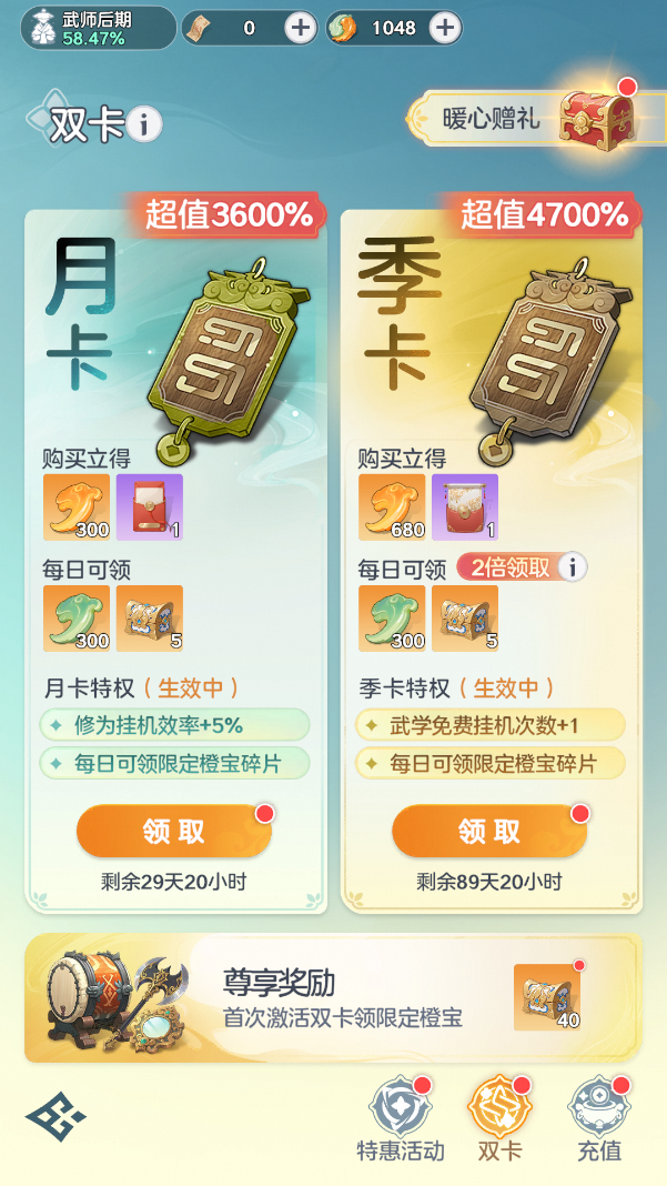 我最先买的是月卡,季卡68有点没舍得买。但是后面卡关发现能多得一次挂机次数,就斥巨资买了。而且激活双卡还能拿橙色宝物,安慰自己这钱花得值得!