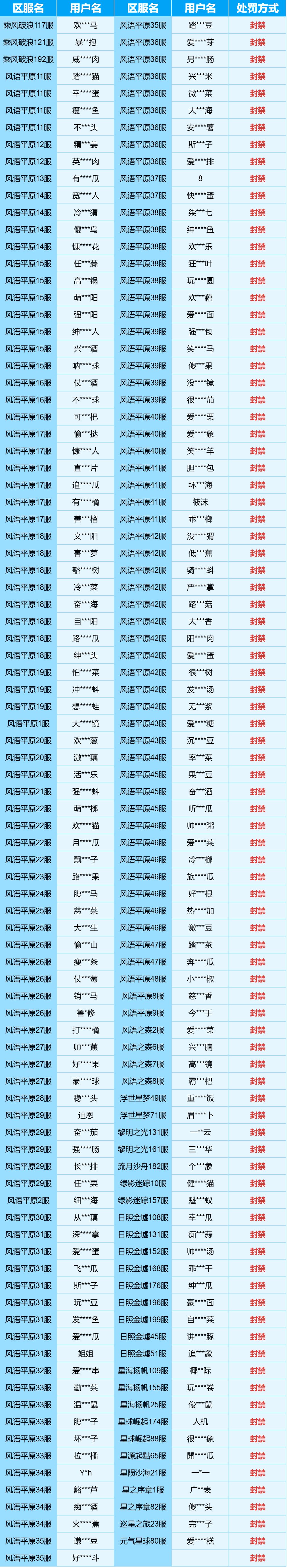 11月13日12:01至11月20日12:00期间,封禁名单公示: