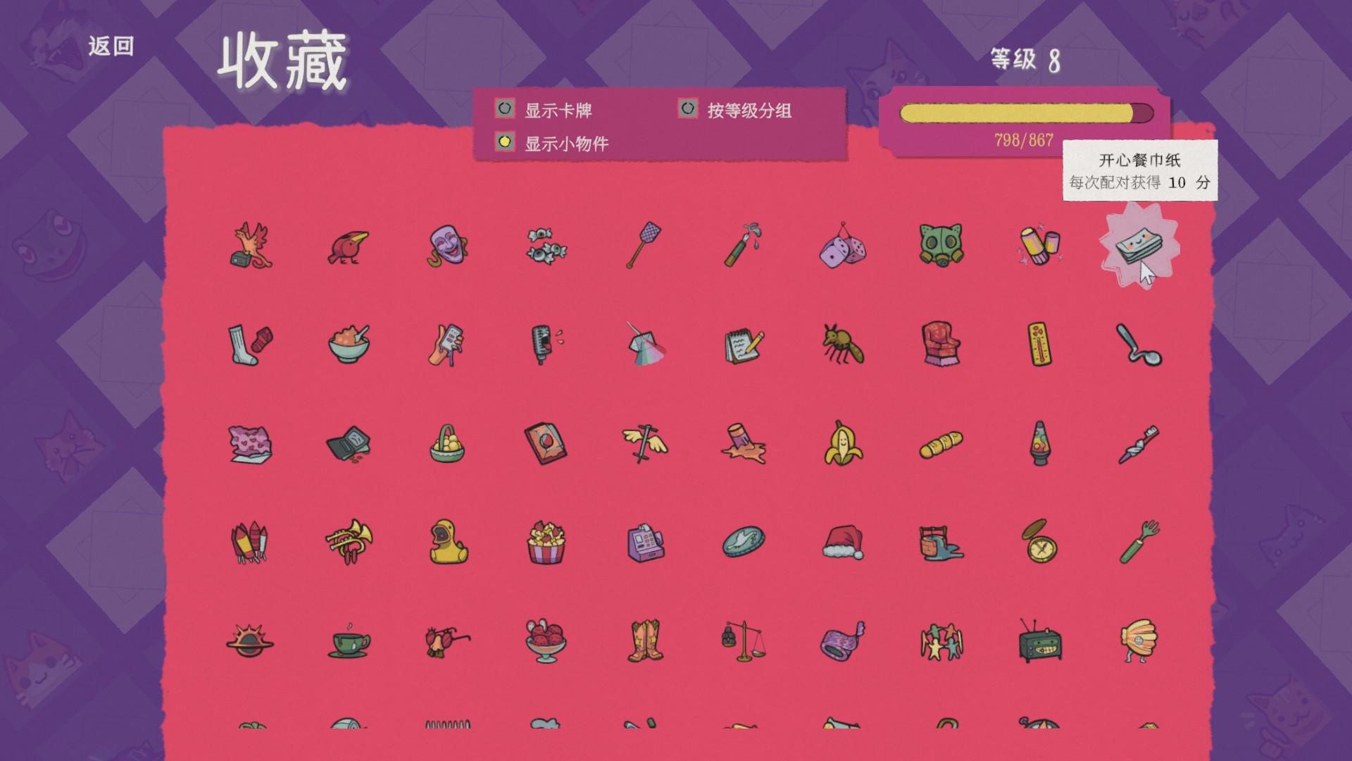 游戏仅有4X4也就是8对牌配对,同时也有红绿蓝紫等颜色作区分,作为肉鸽玩法游戏中也包含些道具(小物件)能辅助玩家,所以记忆力需求方面其实并不高,而当玩家成功配对同款的卡牌后就能获得卡牌上的分数或者效果,最终目标就是规定回合数内到达目标分数既能通过下一关。