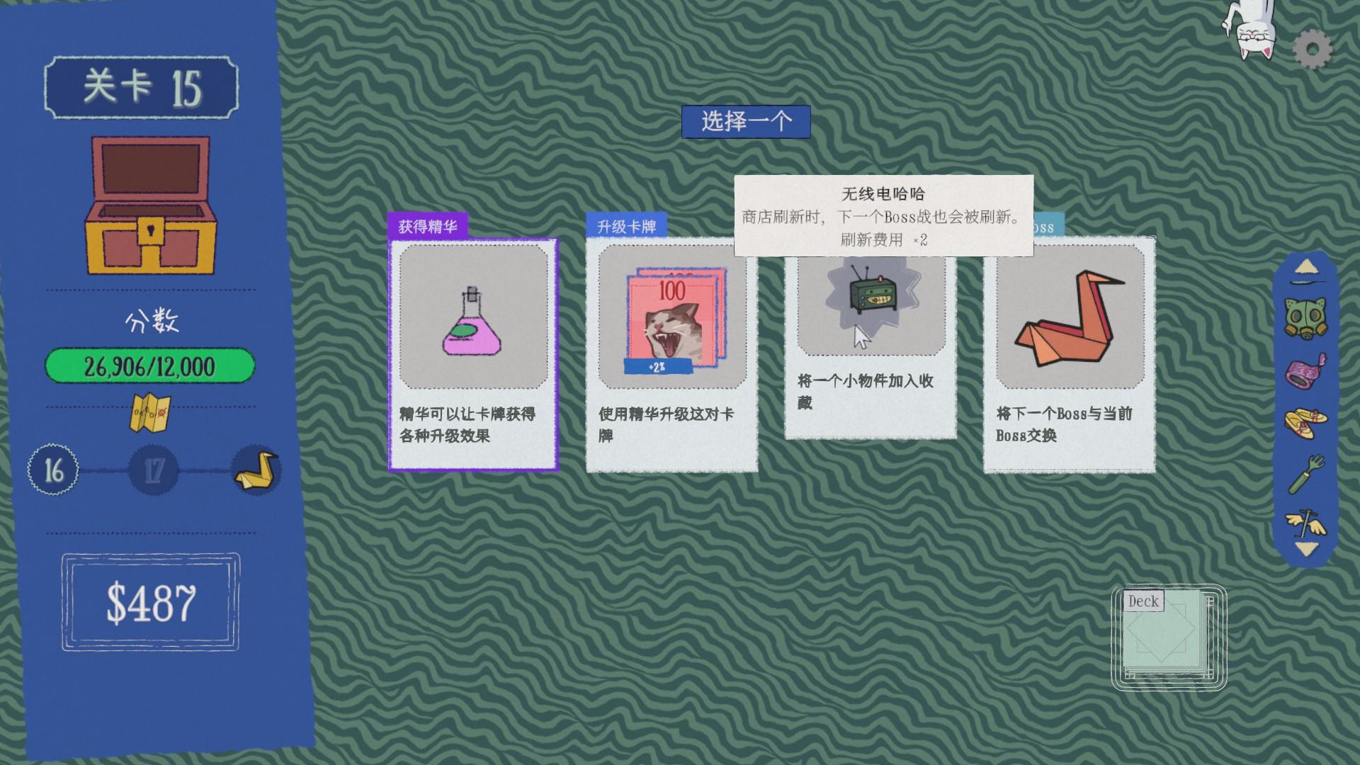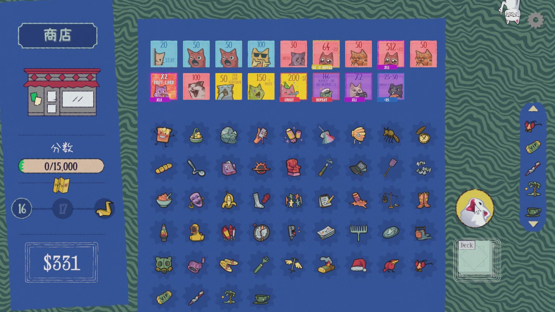 和肉鸽游戏的玩法框架一样,战斗—结算—商店购买道具(刷牌烧牌)—BOSS战斗—选择奖励,商店中会刷新各种卡牌、也会有功能性的道具(小物件)选择购买,游戏说实话金钱很容易获取,很容易可以买空商店,所以游戏主要着重对卡牌搭配的考验上,比如该如何才能让分数的倍率最大化?在通关后可以开启无尽模式,后面分数都是百万级别往上,当然玩家也很容易在一回合单次出牌直接获得100万分。