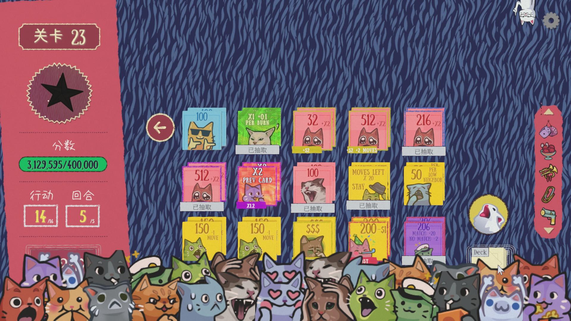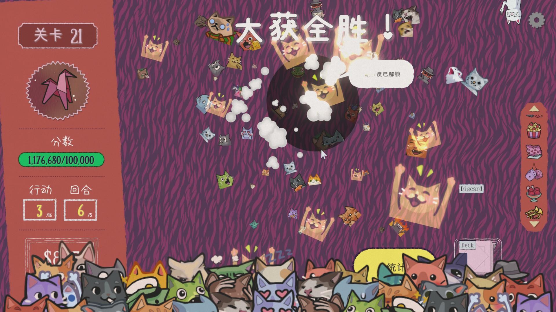 游戏是成功做到了好玩易上手、能为玩家带来脑力挑战、同时也可以需要一定的策略性,而且游戏在各个方面都充斥着许多魔性的猫猫,也为每一张不同效果的卡牌都画上独特的猫猫,没有重复性,而当玩家如果在一回合内就达到了目标分数,会有许多猫猫会为玩家欢呼。