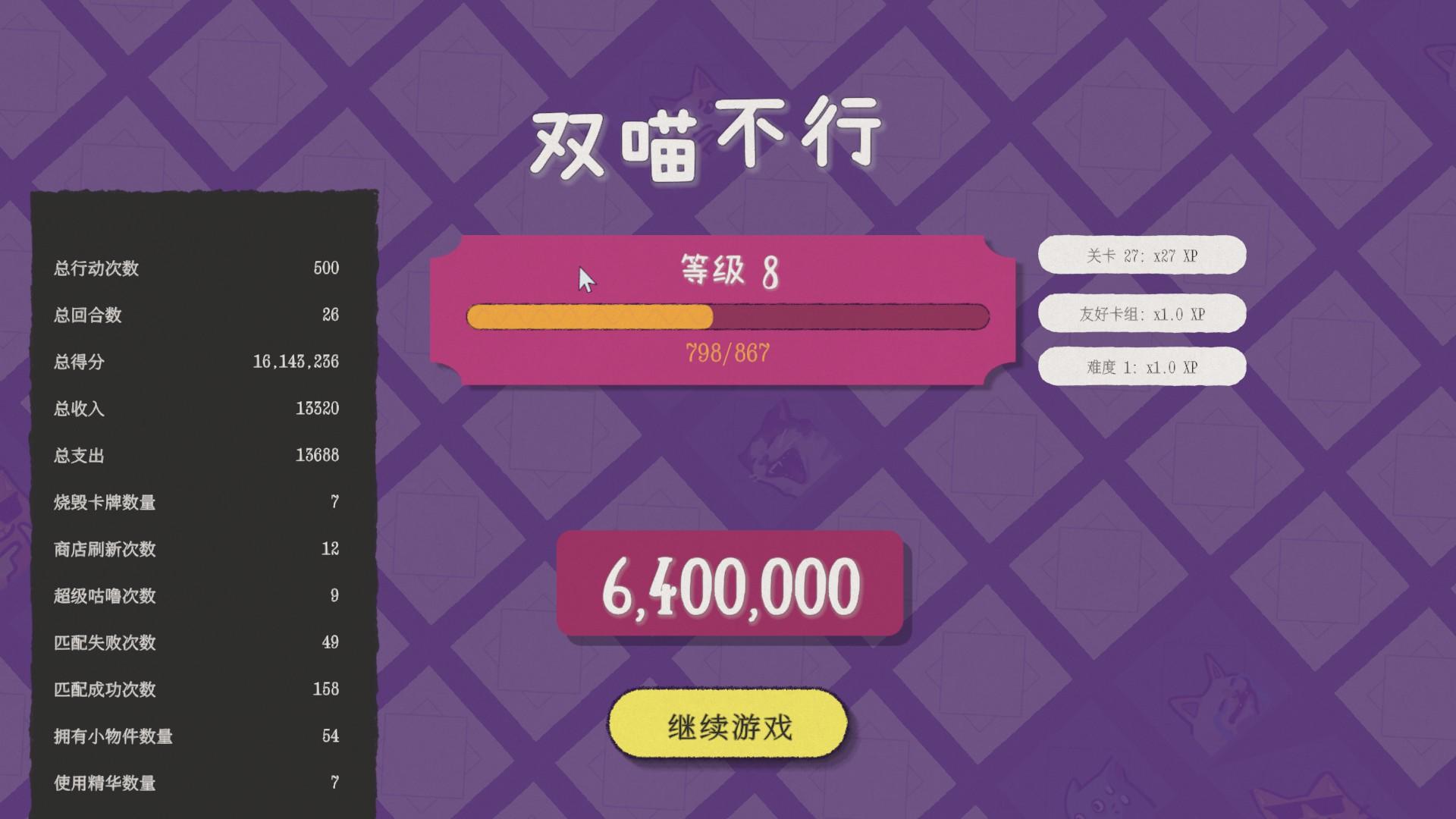 《双喵成行》可以说非常这个取名是十分咬合游戏的,作为一部小品级的翻翻乐卡牌游戏你是真的很难看到游戏有什么问题的,游戏制作精细,画风简约而不简单,好玩有趣,对于猫猫爱好者,如果想尝试下肉鸽版的「记忆翻牌游戏」那么是可以推荐下。