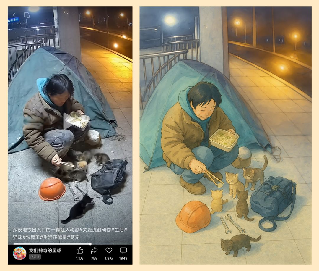 今天是封测第十一日!白天看到团队社群分享的一段视频,瞬间戳中了所有团队成员的心底,视频中是一位在地铁站出入口搭帐篷生活的打工人,自己还在为生计奔波,却在吃食物时特意分出一份,温柔投喂着旁边嗷嗷待哺的小流浪猫。这一幕让大家纷纷动容,这份平凡生活里的纯粹善意太动人了!所以团队当即决定,要把这个温暖做成照片,成为猫猫旅行见闻中的一幕。