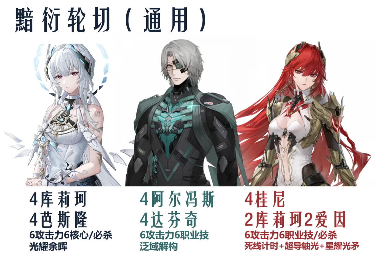 灼惘4桂尼2库莉珂2爱因,共鸣攻击力+职业技,大招也可以,不强求。