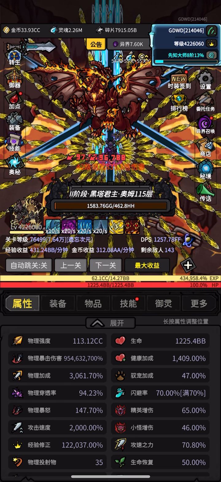 物理强度113.12CC,爆伤9.54亿,生命1225.4BB,生命感觉可以压缩到1000BB左右