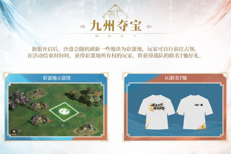联名主题新服开服一定时间后,沙盘会随机刷新一些地块为彩蛋地,主公可自行前往占领。在活动结束时拥有彩蛋地的玩家,即可获得iG联名T恤好礼。