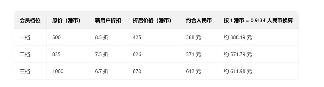 此次活动截止至12月1号。 这次会员也参与了折扣。新用户(指当前为非会员状态)开一档会员8.5折。原价500港币,折后425港币(约388元)。但根据一些朋友反馈,他们开一档没有折扣或只有8折,还是以实际情况为准;二档会员7.5折,原价835港币,折后 626港币(约571元)。三档会员6.7折,原价1000港币,折后670港币(约612元)。