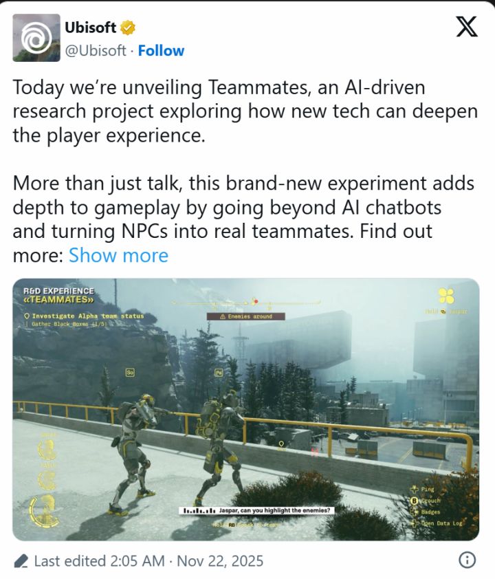 核心玩法全靠“一张嘴”。你可以通过自然语音指令指挥队友走位、杀敌,甚至让助手修改游戏设置或讲解剧情。叙事总监 Virginie Mosser 称,AI 会根据玩家的指令实时反馈,真正实现“由你重塑故事”。虽然官方强调这目前仅是实验,但外界猜测其技术核心可能与泄露的新作“Project Scout”有关。如果不远的未来,队友能随叫随到且“情绪稳定”,那对于受够了联机路人的玩家来说,或许反而是个福音。#今天游戏圈发生了啥 #发现好游戏 #游戏日常