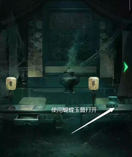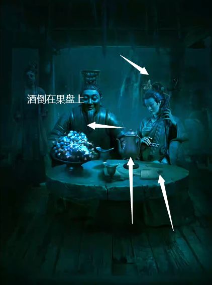 4、左边进入花园,从女人头上取下蝴蝶玉簪,桌上可获得空奏折和酒壶,把酒倒在果盘上,可看见葡萄上都写着字。(记得取回空酒壶)