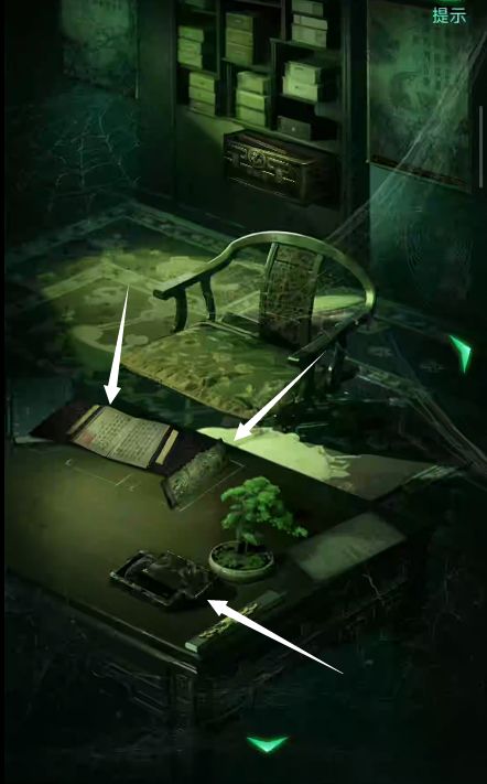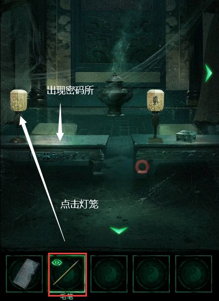 1、进入右边的书房,桌上获得毛笔,书柜左右的两幅字画和桌上的书都有字谜。