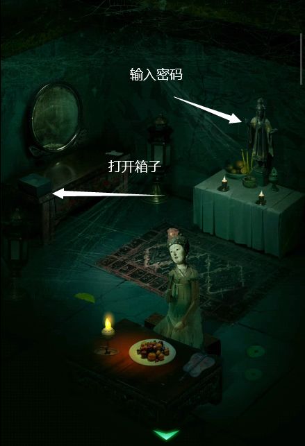 10、根据信息点击观音像身上的密码(字序为从右到左),获得钥匙。使用钥匙打开梳妆台的盒子,获得废帝玉玺。