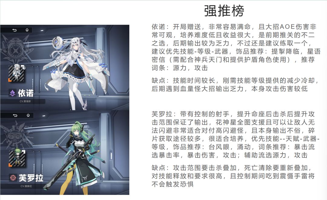 目前的话必练榜的话是推荐一定要练的,无论是你日常过关还是打一些活动以及裂隙和禁区什么的,都是可以用得到的,强推榜的话,只是目前来讲比较强势或者泛用性比较广的角色,至于技能的详情的话,可以按照我写的优点来找到对应的技能并升级