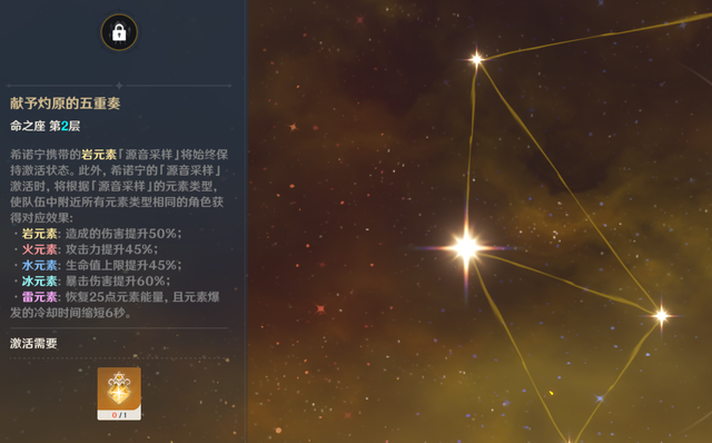 接着是希诺宁,她是一名泛用性极强的全能辅助,实战中,能够为队伍提供治疗、增伤等多种辅助效果,0命就是完整体,能够辅助水、火、雷、冰元素主C,提升到2命之后,还能够对岩元素主C有增益。