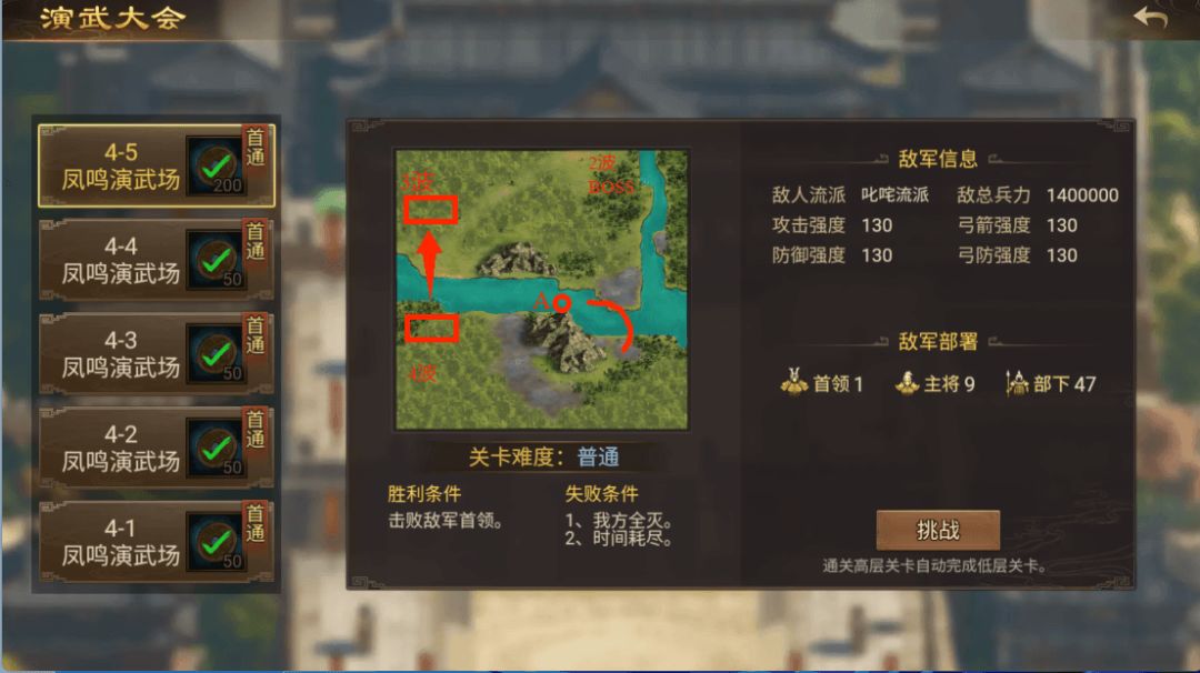 - 4-5的击败首领则需要消灭前面总共15个小兵才会出来【4-5每波都是11个人,前4波一共44个人。场上最多30个人,要想boss出来,除了boss只能存在29个敌人。需要杀的敌人=敌人总数(44人)-只能存在的敌人(29人)=15人】