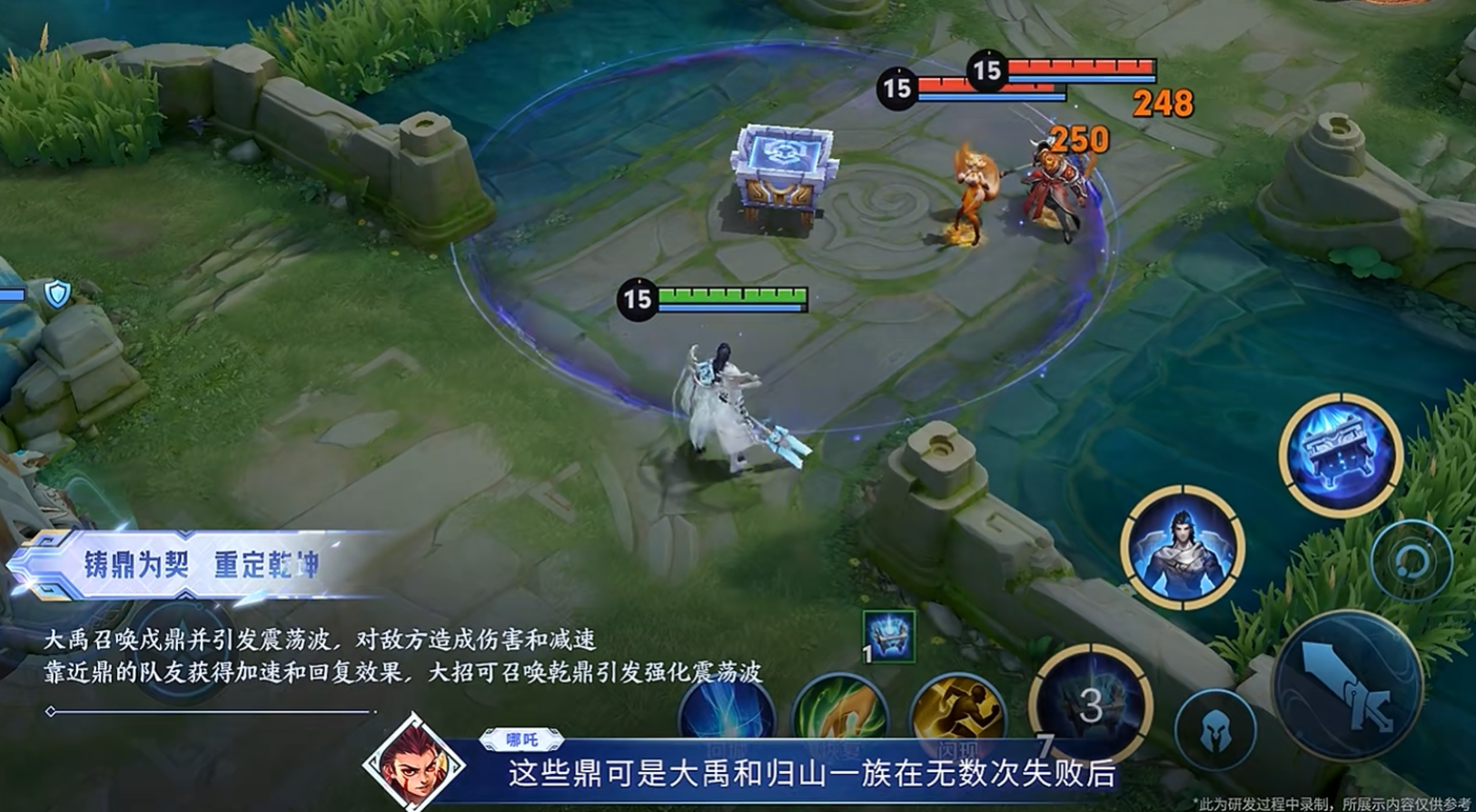 作为取材于上古传说的新角色,大禹以青铜鼎为核心武器,技能设计兼具战术性与支援力:召唤鼎可触发震荡波,对敌方造成伤害并减速,而靠近鼎的队友能获得加速与生命回复效果,更可通过鼎间传送实现快速支援,完美契合辅助定位。