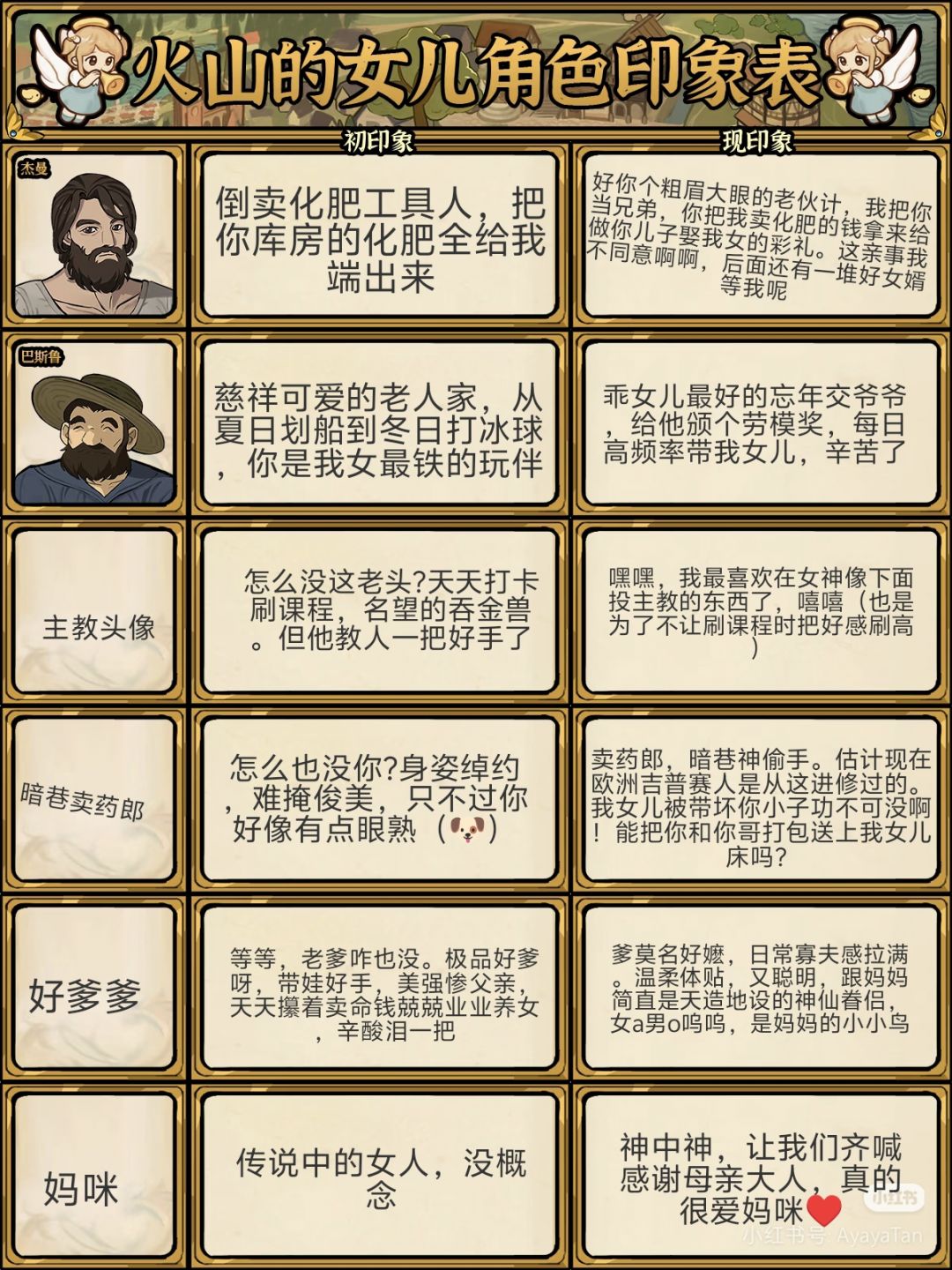 (印象表已经添加了主教,暗巷站街卖药郎,爹妈二人评价)
