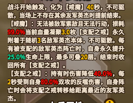 【戒魔】:无法被敌军索敌且无法行动,损耗99.0%当前血量凝聚3枚[支配之戒】永久附着于随机3名敌军英杰本体,不可驱散。每有被支配的敌军英杰阵亡时。自身永久提升25.0%生命上限,最多可叠20层。结束时收回所有【支配之戒】
