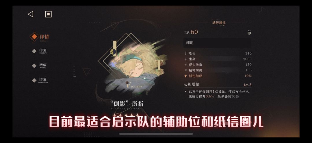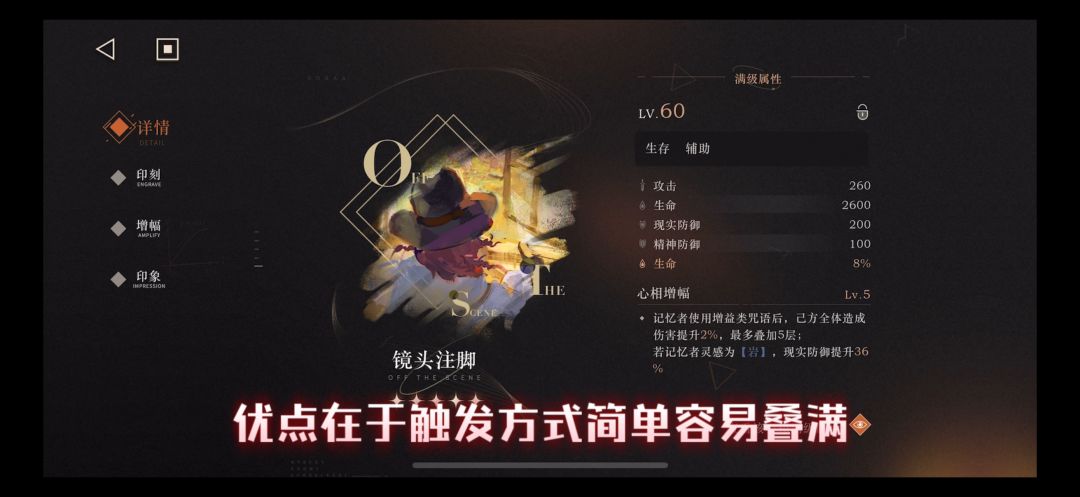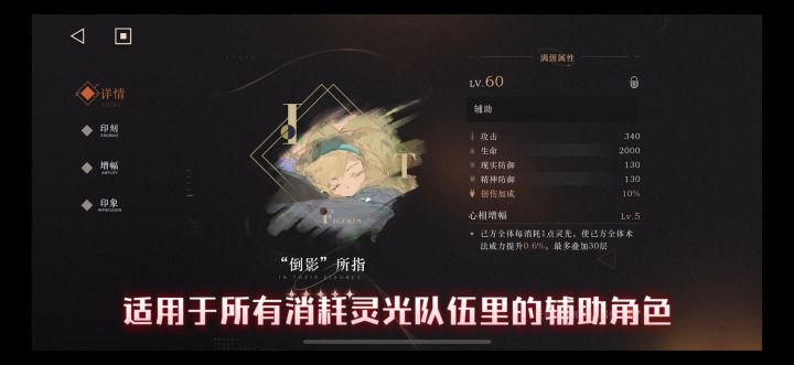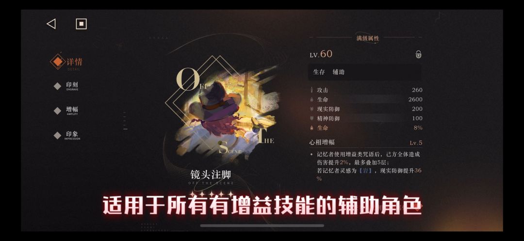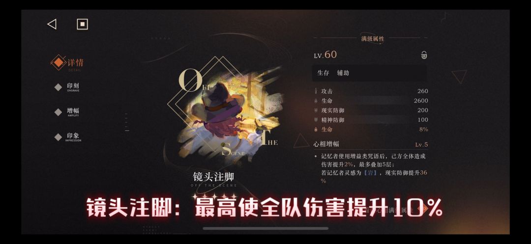 镜头注脚:最高提升全队10%伤害 适合所有增益辅助角色 很容易叠满