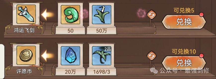 - 可兑换5个鸿运飞剑和10个许愿币。
