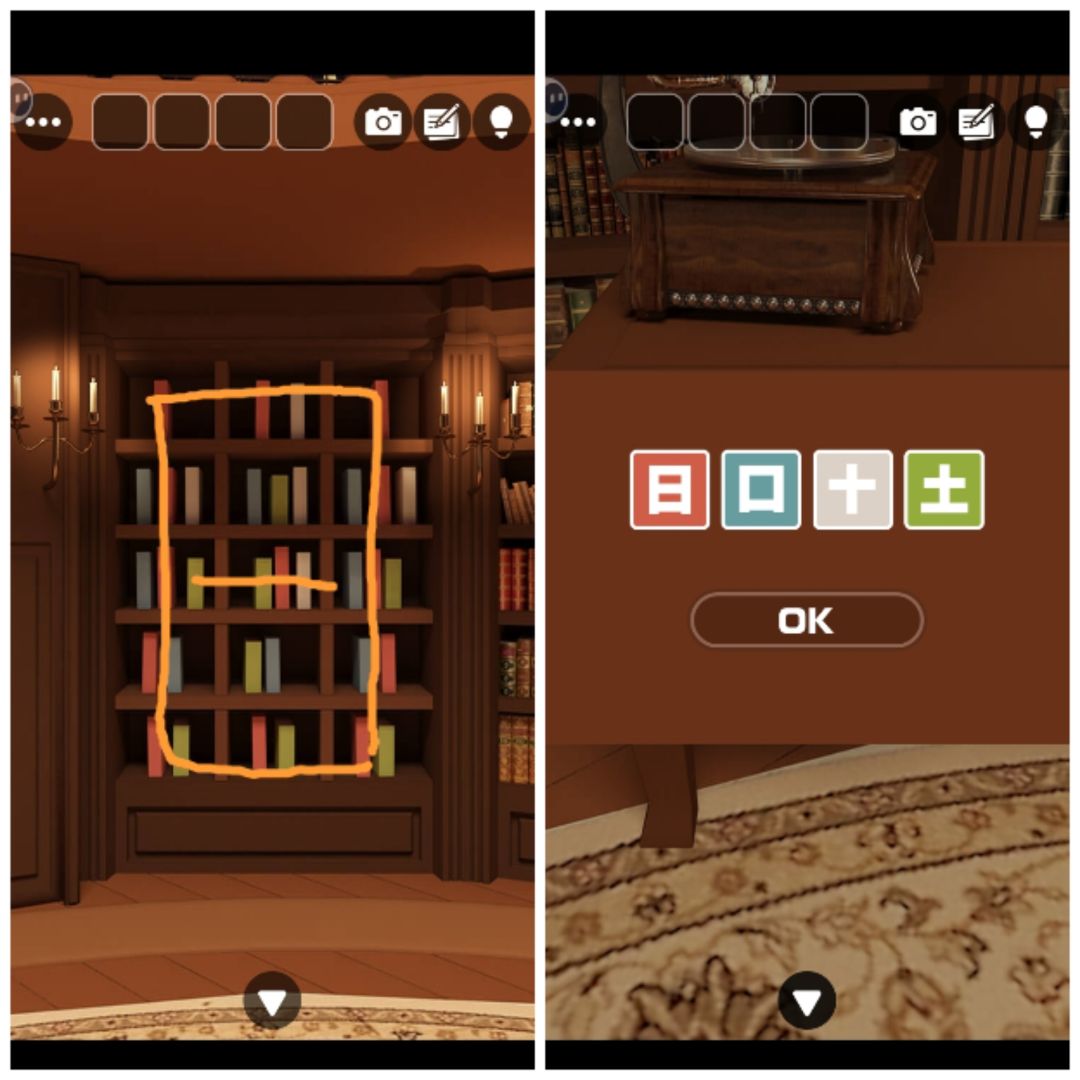 观察书架不同颜色书组成的形状,得红8、蓝口、白十、绿土,打开场景2书桌左下抽屉,获得剪刀。