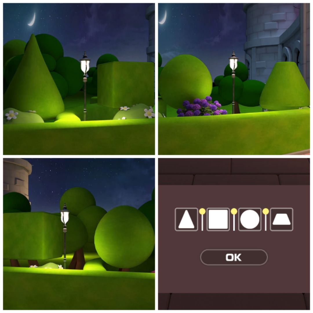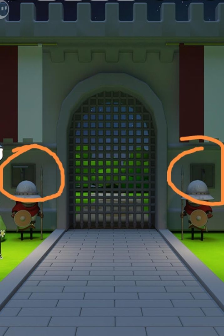 4.场景向左回到城堡前,用火柴点燃士兵的火把,士兵会把路灯点亮,观察两边草丛可得:三角形→正方形→圆形→梯形,打开路中间的砖头,获得放大镜。