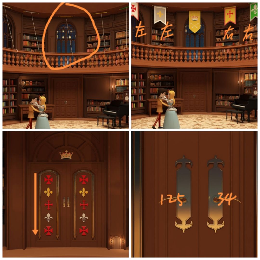 将门把手按在场景2的门上,注意门上图案顺序,结合左右边,可得:左左右右左,进入舞厅。
