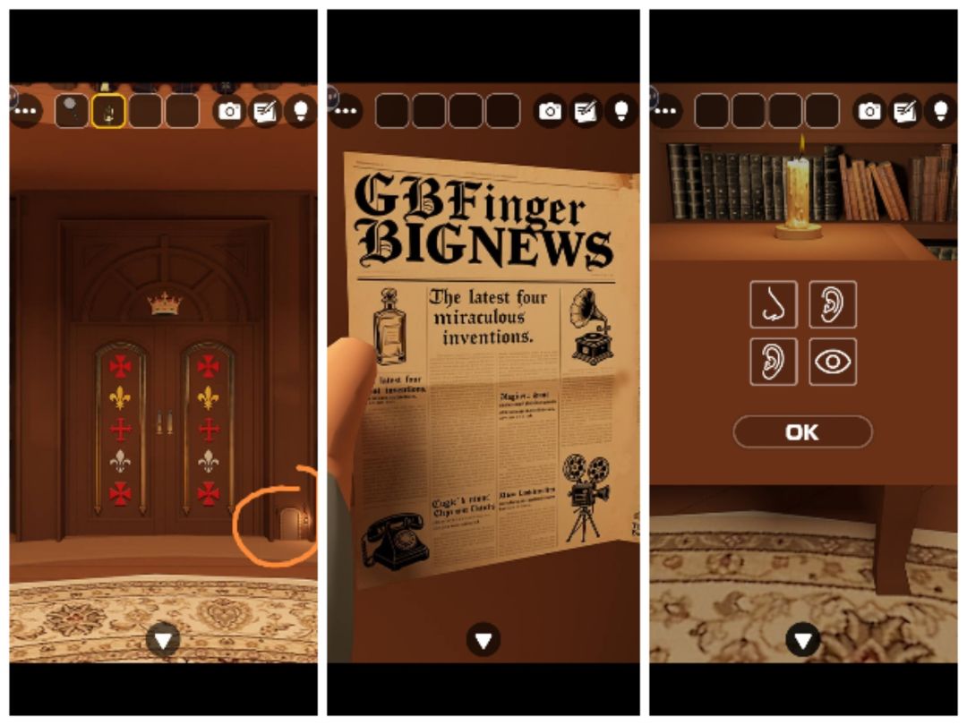 结合谜题:酒的气味需要鼻子闻,留声机和电话的声音需要耳朵听,放映机的画面需要眼睛看。
