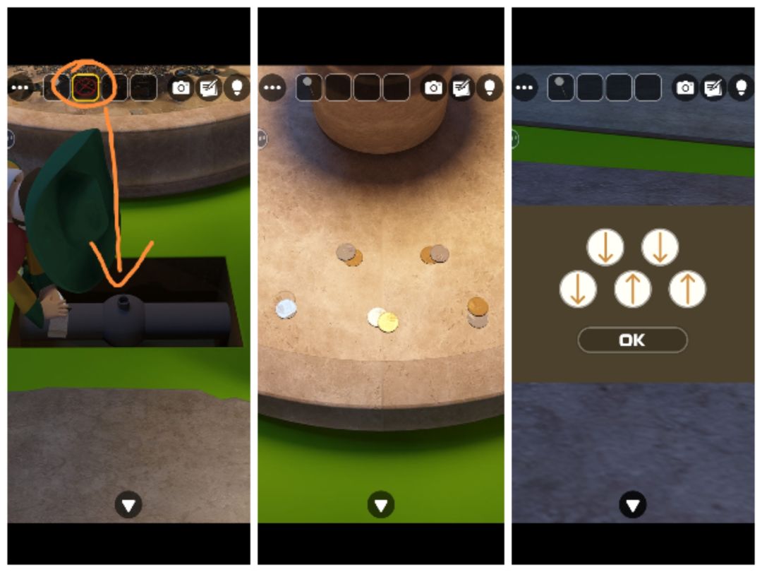 6.到花园翘起的石板处,按上阀门,喷泉水被抽干,点击喷泉观察铜币有无被盖住,被盖住箭头向下,反之向上,打开凉亭前小路上的布袋,获得通行证。