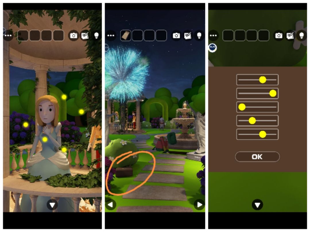 3.注意凉亭中灰姑娘对话的先后顺序:王子→灰姑娘→王子→灰姑娘→王子。点击灰姑娘放大,观察黄色光球的位置:45123,打开草丛前的盒子,获得火柴。
