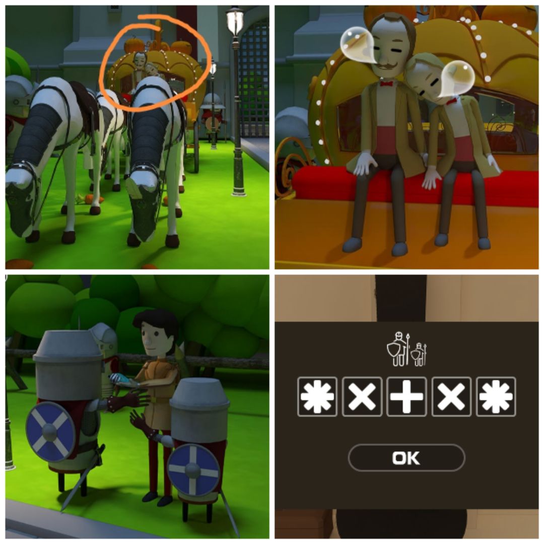 5.点击城堡大门,点击左边的石柱,剑对应王子,鞋对应灰姑娘,根据凉亭二人的说话顺序点击:左右左右左,获得阀门。