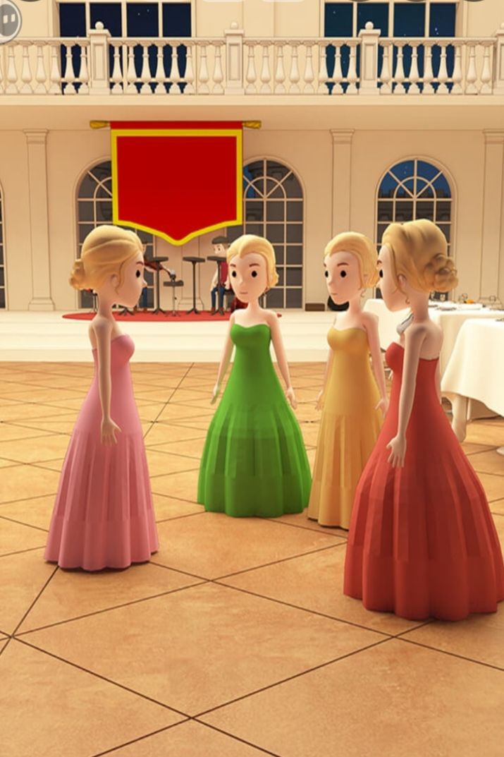 13.观察舞厅右侧四位女士的礼服颜色,将舞厅左下桌上的酒杯调整为对应的粉绿黄红。