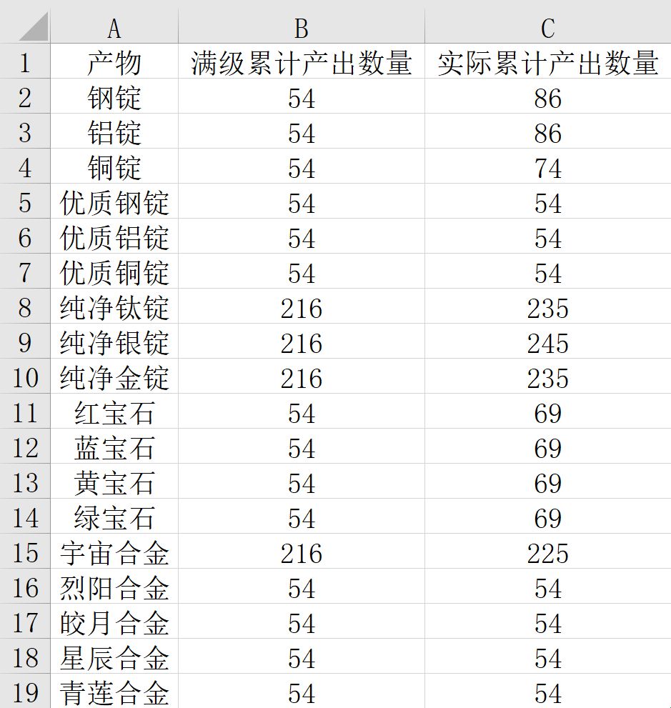 及(矿石/产物)材料数量需求