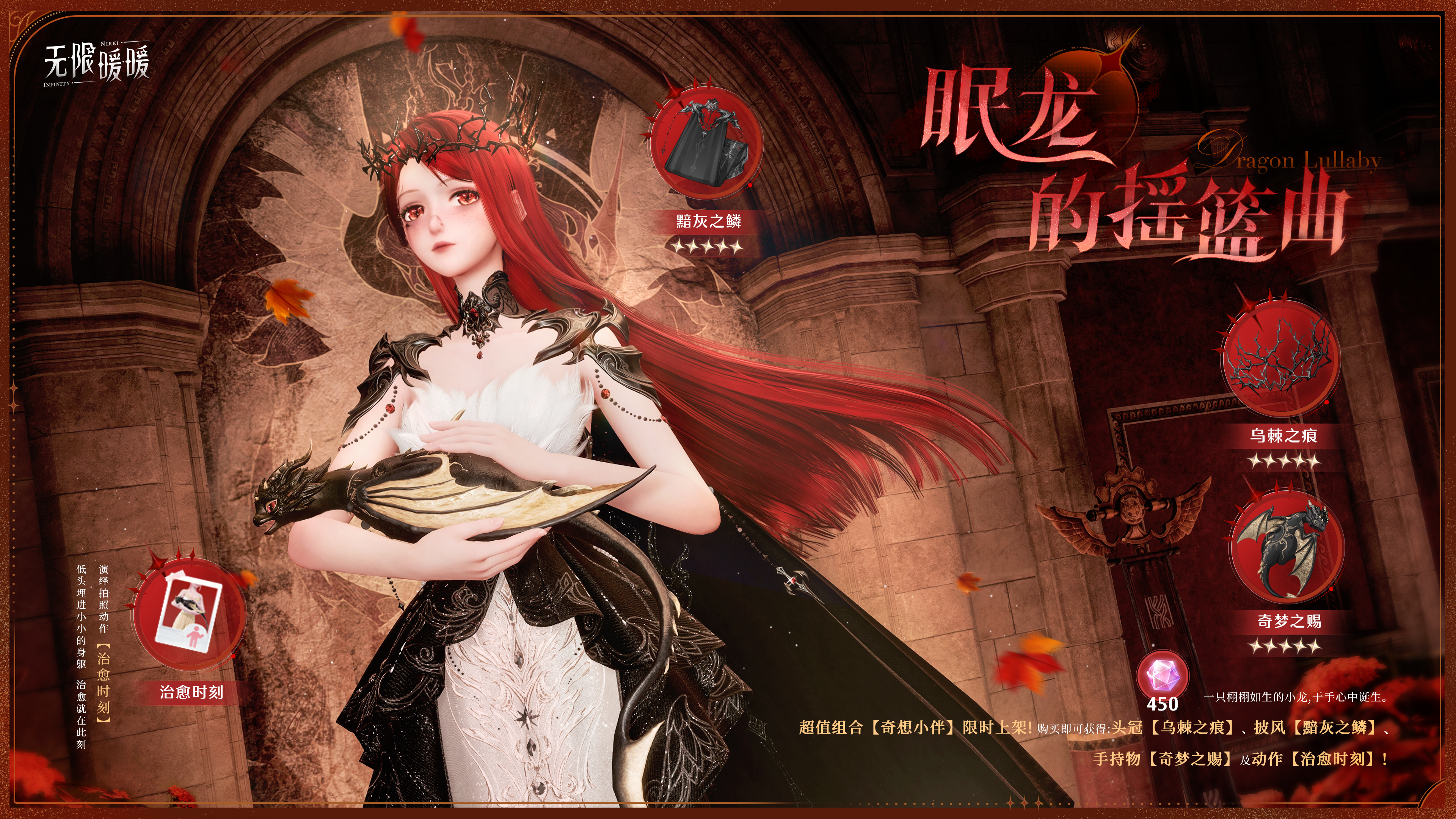 ● 花费450钻石即可获得:帽子【乌棘之痕】、背饰【黯灰之鳞】、手持物【奇梦之赐】、动作【治愈时刻】!
