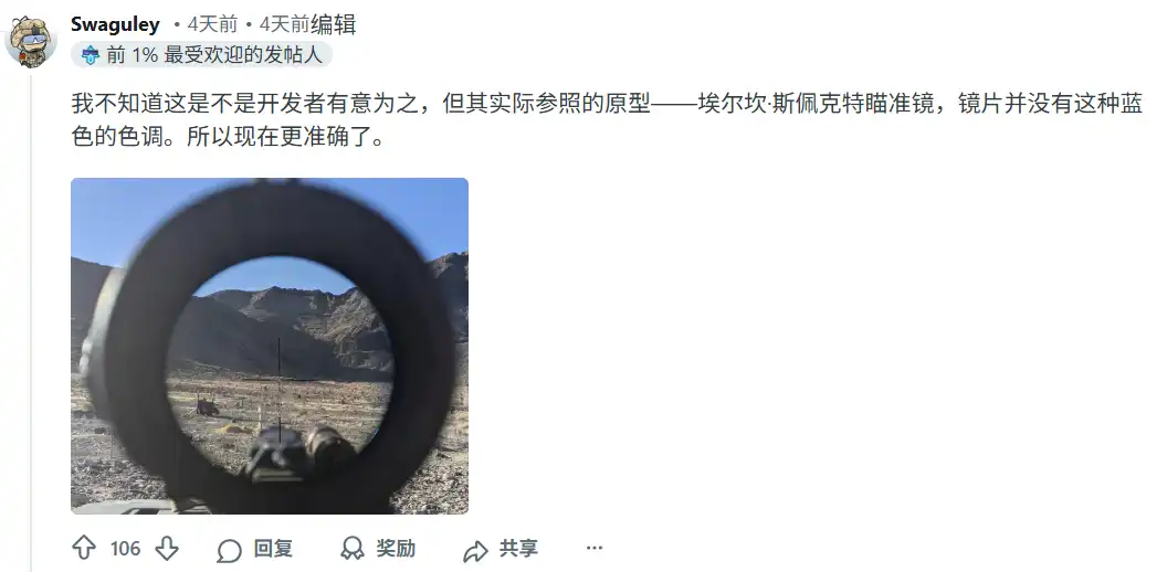 该瞄镜是在上个月第一季更新中加入的,但其类似夜视仪的色调让许多人质疑这是不是漏洞还是有意为之。 DICE 却从未对此发表评论,目前该色调已被移除。