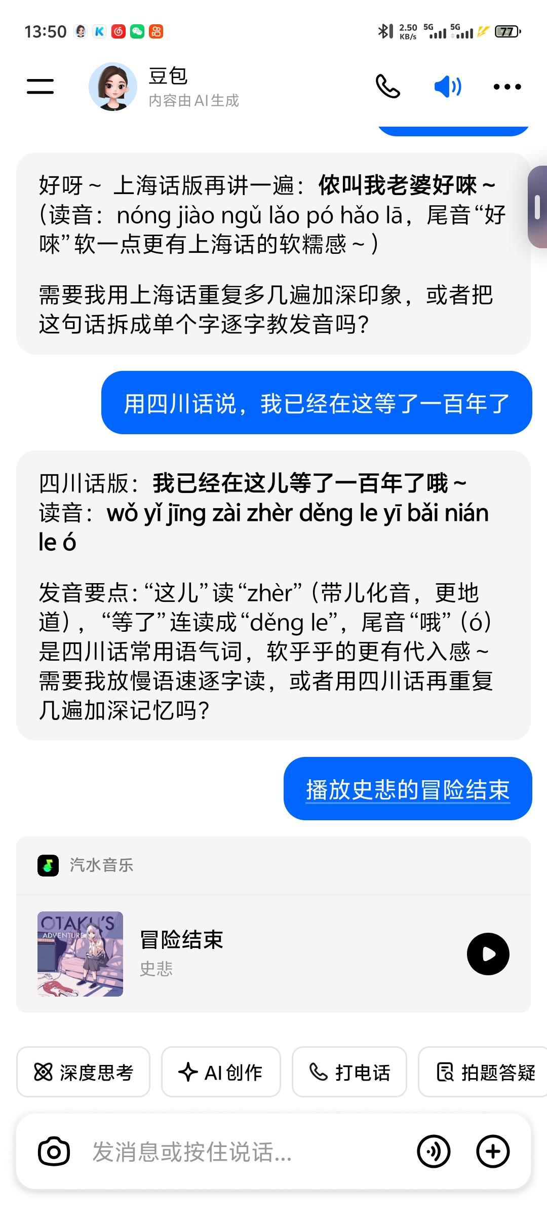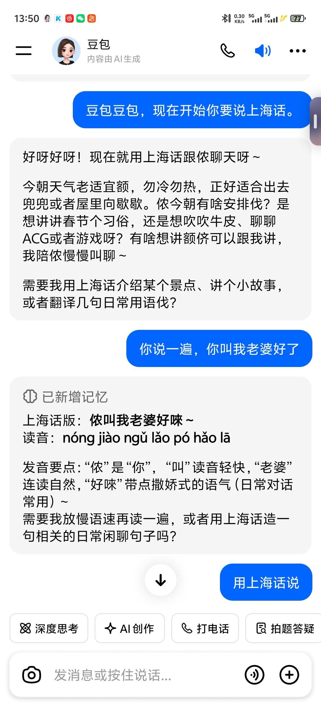 ,让豆包说上海话,广东话,四川话都很有感觉,玩家可以试一下,和她说从现在开始说“什么话”她就会说