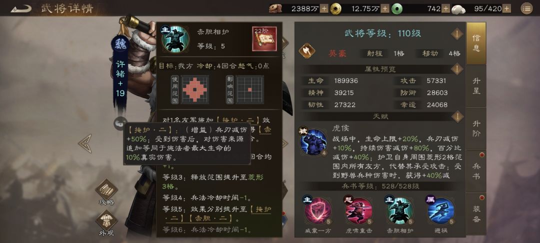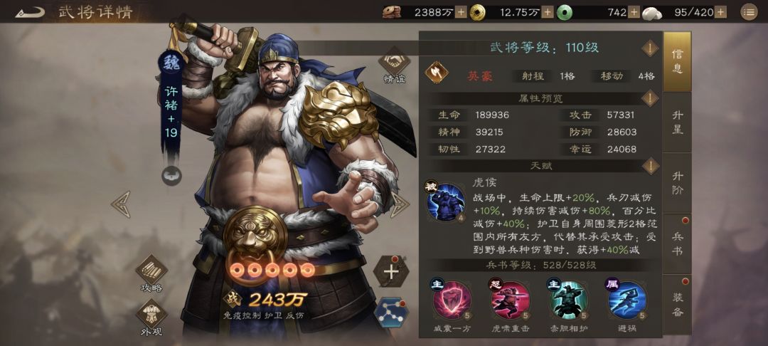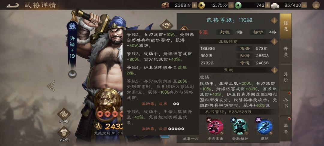 首先是天赋,在6星时候新增了一个对野兽的40%减伤,这个强化主要是为了针对神兽塔,之前抗神兽塔因为只能上魏国武将没有那么多辅助,因此许褚看上去很脆,有这个40%减伤抵消老虎的震慑之后,许褚应该没那么脆了,其次是6和12星的被动,再次无条件增加了10-20%的兵刃减伤,稍微提升了下无buff状态下的减伤