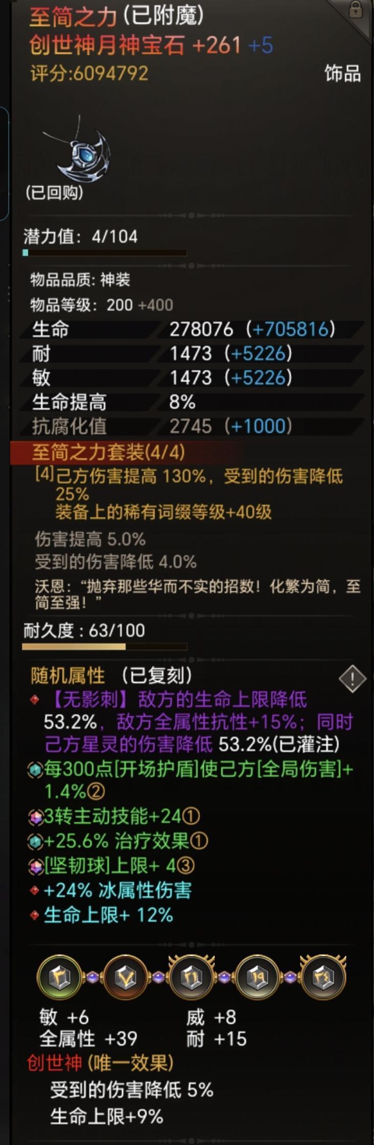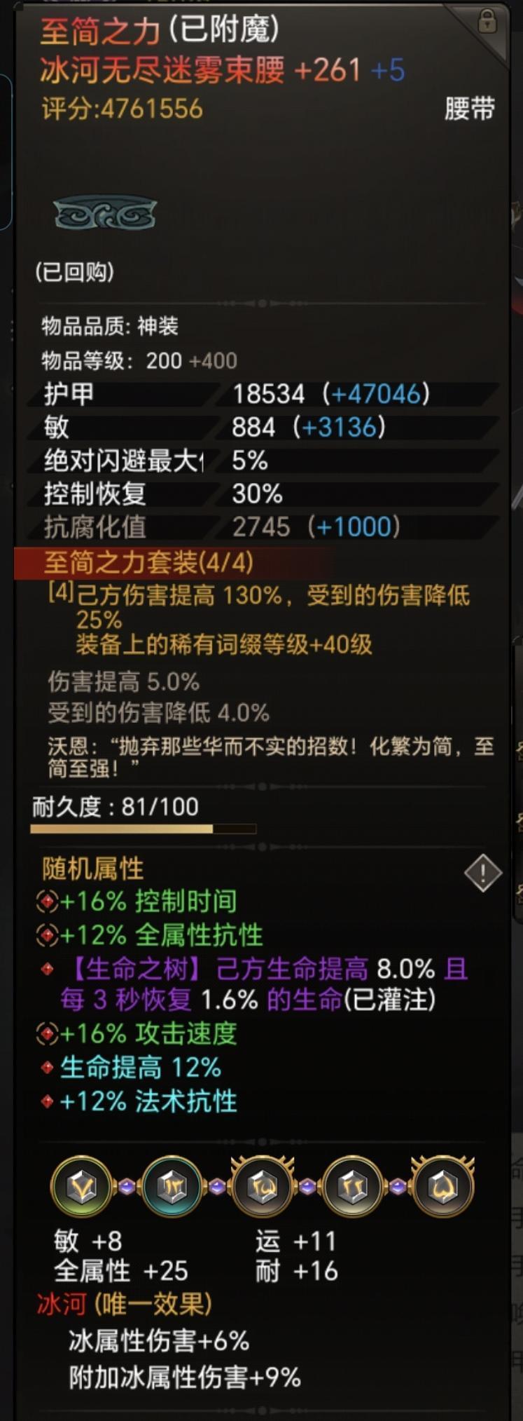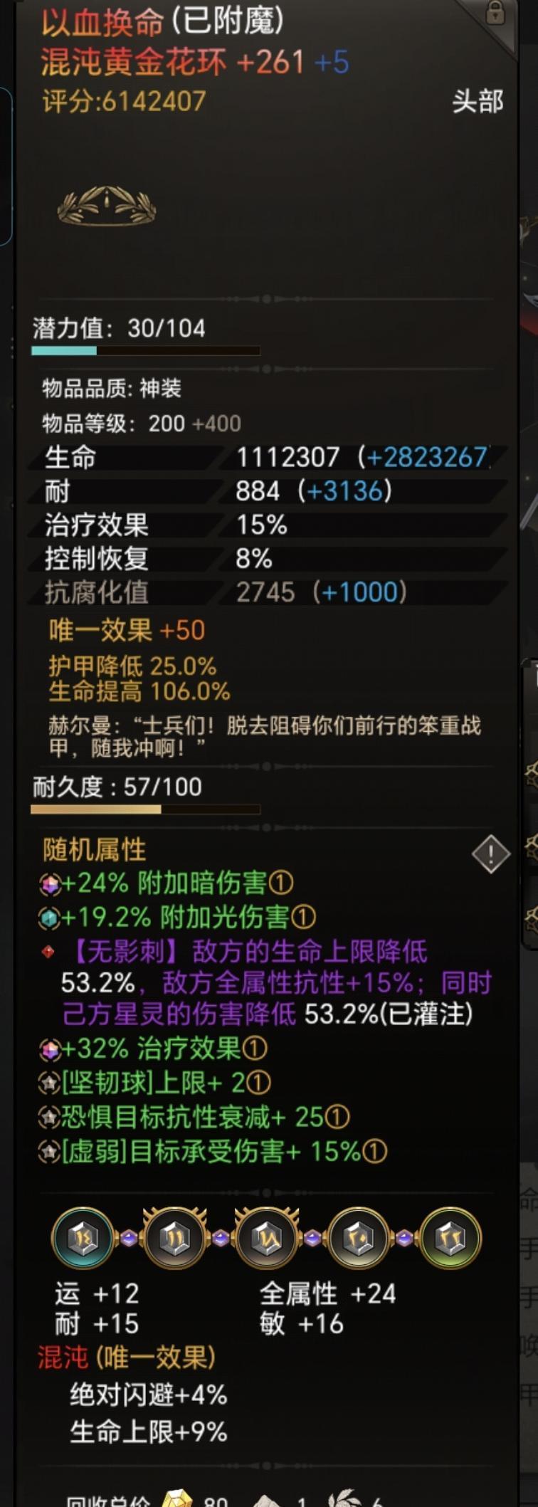 装备词条如下,主要就是要带上稳固词条走远程,远程保证能叠满稳固,稳固的生命是额外,加伤很高,其他参考,是可以优化的,比如头带球加攻击伤害这些,主要老牛改的现在特殊词条很难出,都不要说蓝色词条了,凑合看一下。