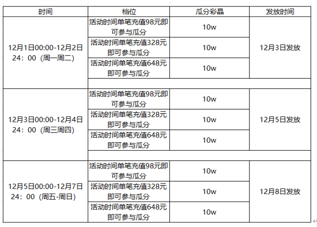 Ps:所有用户都可参加,不同档位可同时获取。需要对应单笔充值金额才能进行参与活动瓜分奖励、瓜分奖励会在指定日期进行发放,以此类推~