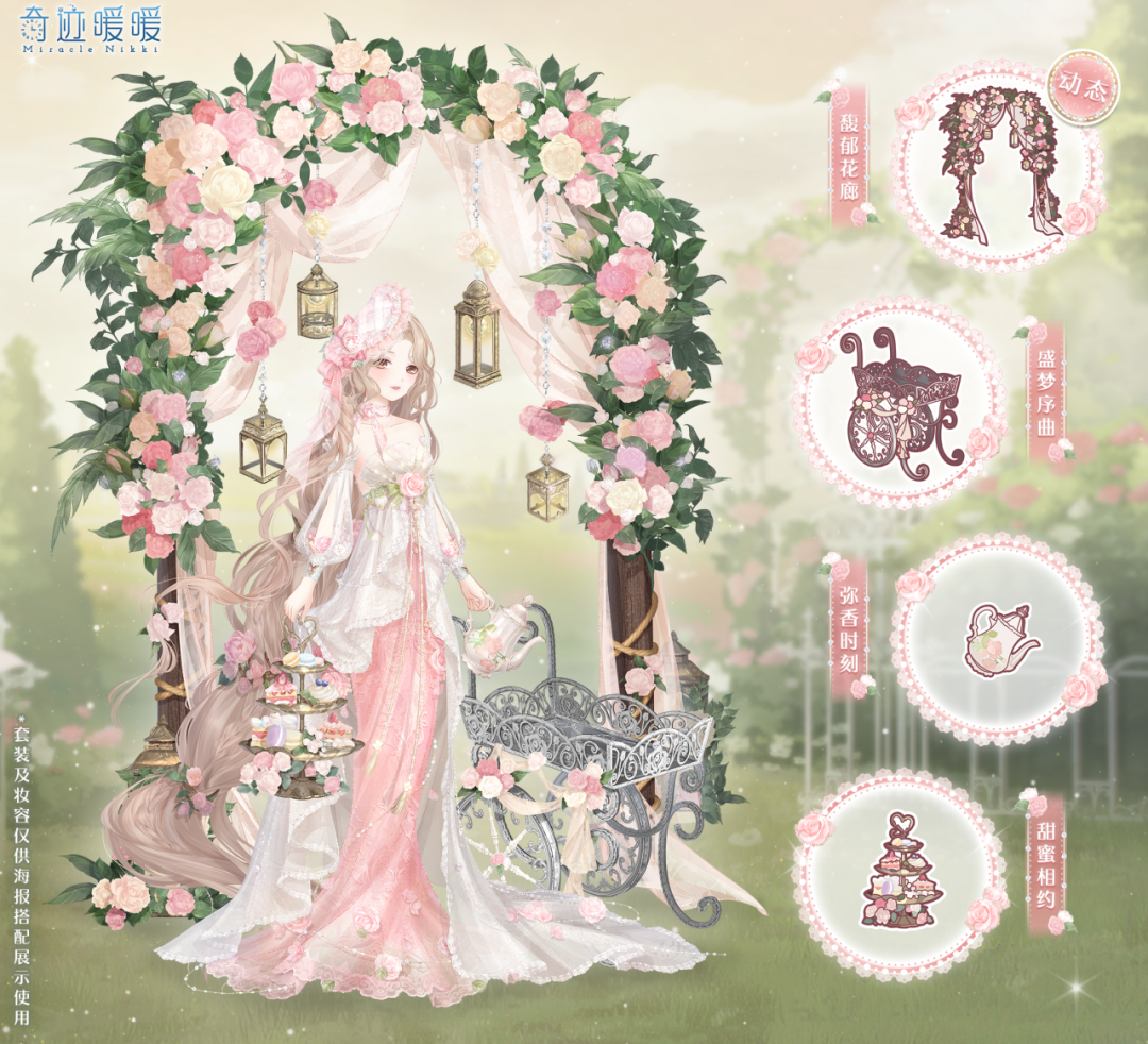 【超稀有限定部件】含动态摆件“馥郁花廊”,精美可移动摆件“盛梦序曲”,精美手持“甜蜜相约”、“弥香时刻”。*套装及妆容仅供海报搭配展示使用。