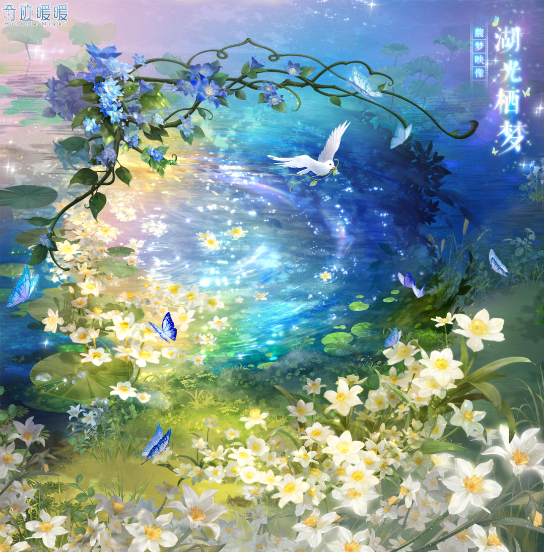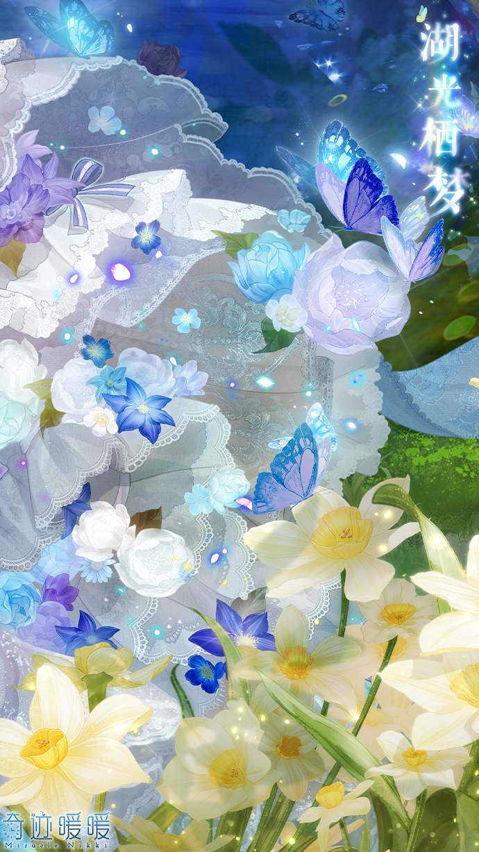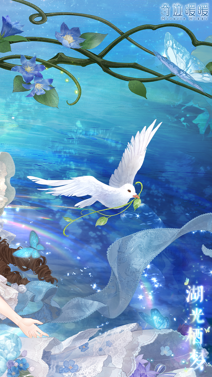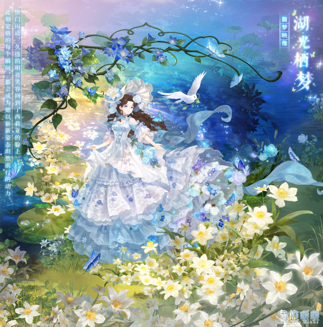 【湖光栖梦】含全新妆容“拾忆欢颜”,精美面饰“心花知梦”,蝶舞特效连衣裙“湖光栖梦”,动态摆件“白羽衔诗”、“栖花秘境”、“萦梦湖畔”,精美特效摆件“摇曳繁花”,动态胸饰“馥花纷飞”。