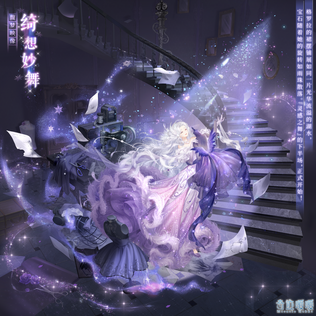 【绮想妙舞】含正常姿势与特殊姿势,全新妆容“灵感祈愿”,特效连衣裙“绮想妙舞”、“幻像舞约”、“璀璨织心”,动态摆件“灿然光境”、“浮影秘语”,特效摆件“盈光奇想”,精美可移动摆件“溯愿长阶”、“美妙灵感”。