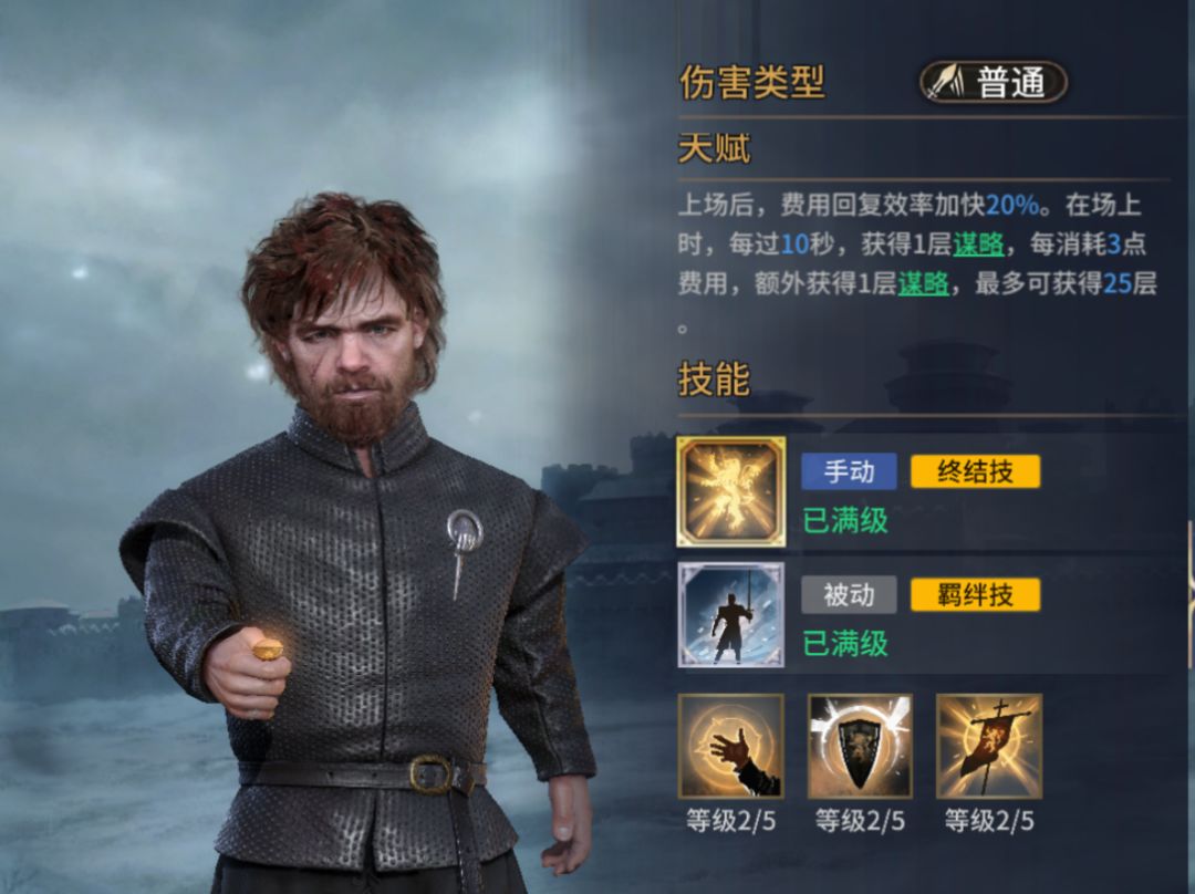 这套打法阵容是以狮家兄弟为核心,准确来说小恶魔提利昂是最关键的角色,詹姆相对来讲只是起到个辅助作用。先来看一下他们两个的技能和用法。