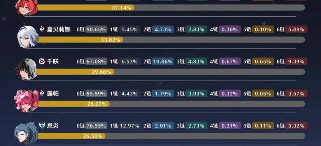 千咲的持有率涨幅持续强劲,次日数据较首日再增4%,反超嘉贝莉娜并逼近尤诺的纪录。其零链持有率虽暂列总榜倒数第七,但上升势头迅猛,尤其在韩服/日服市场表现亮眼,助推游戏登顶区域榜单第二。同期结束的仇远卡池角色排名稳定第七,守岸人、珂莱塔等老牌角色仍保持90%以上的高持有率,印证了经典角色的长线价值。