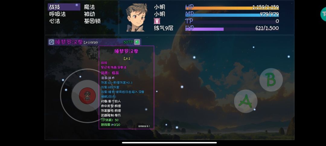 (开局前往坐标<16,14>百货店,进入后购买一个美味面包,再来到坐标<28,18>进入东部森林,与白发乞丐对话他会给你一个技能,如下↓)