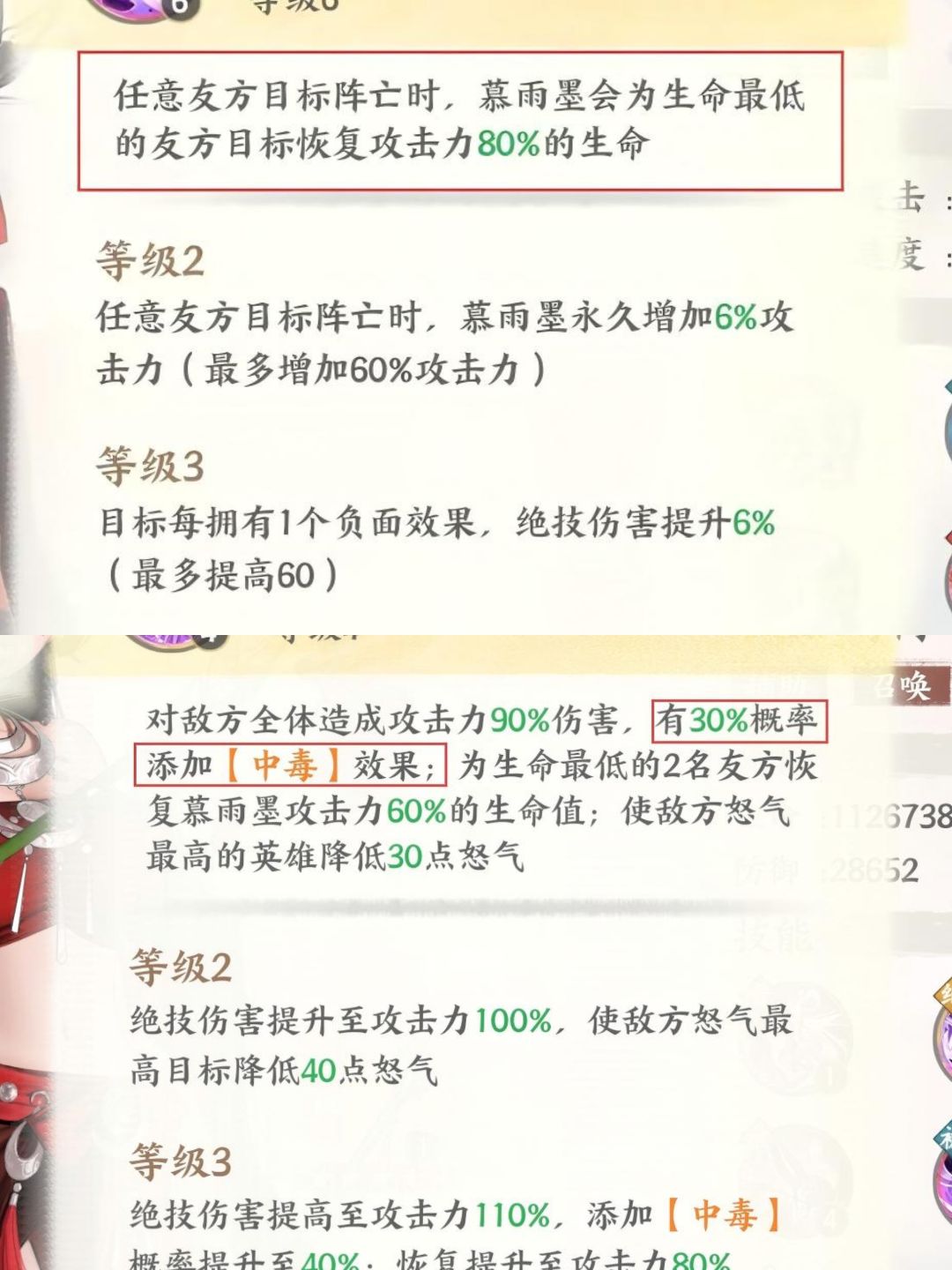 携带者绝技后,40%的概率为命中者添加【中毒】效果,任意友方目标阵亡时,携带者为生命最低的友方目标恢复攻击力80%的生命