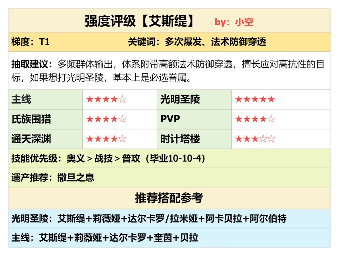 艾斯缇在莉薇娅在场的情况下,可造成2次奥义伤害,拥有高额的群体爆发能力。黑夜体系主要以群体输出为主,拥有出色的减伤、持续作战能力。