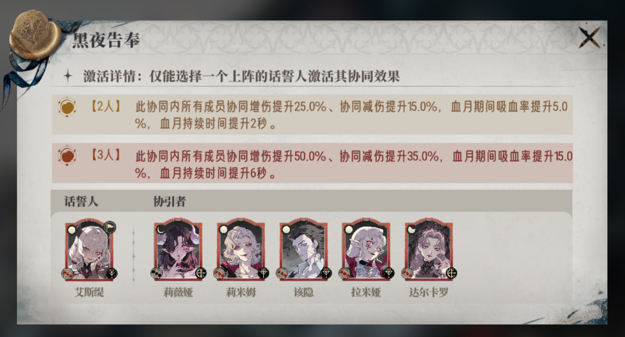 协同&潜血:黑夜协同在凑齐3人时可提供50%增伤、35%减伤,体系机制是可延长血月时间、给成员附加吸血能力。特性“超感知觉”黑夜协同成员溢出的治疗效果30%会转化为潜血(相当于是护盾,额外的血条),只要持续打伤害,队伍成员就能不断叠潜血提升自身生存。