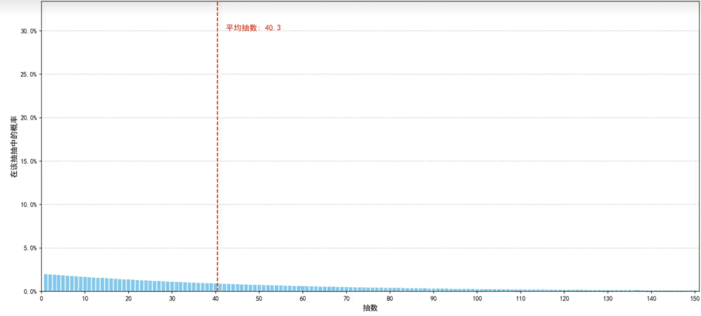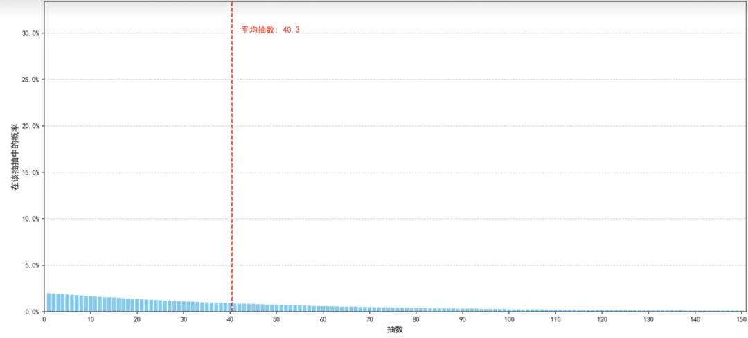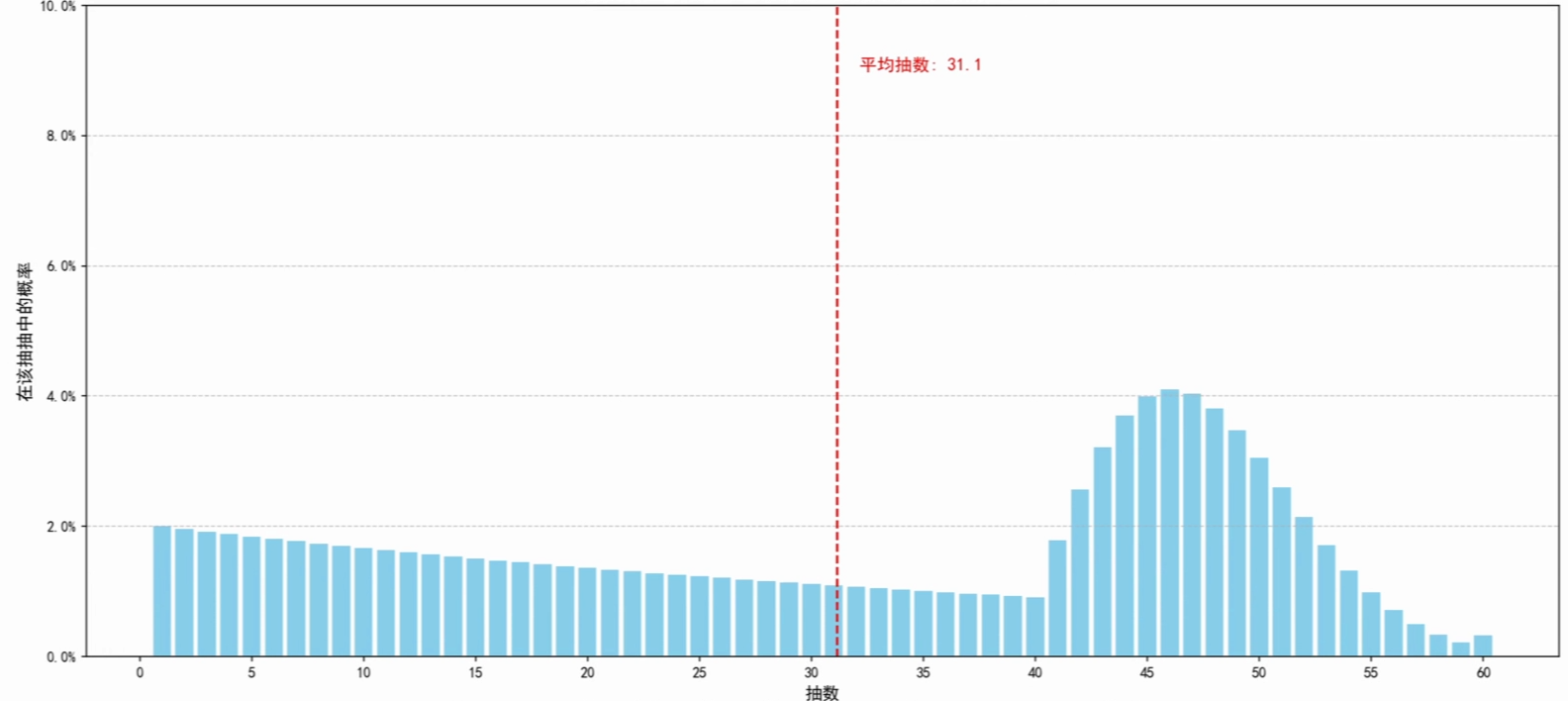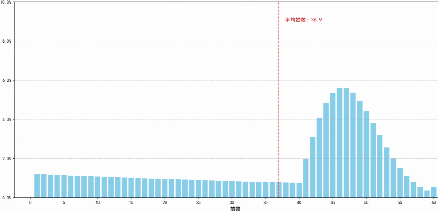 吗?很显然不是,因为这样的话60抽才出货的概率也太高了叭!在盲盒派对中有一个软保底机制,这个机制让抽卡从41抽开始每抽都比上一抽高+2%,有了这个机制,抽数曲线就平滑多了。